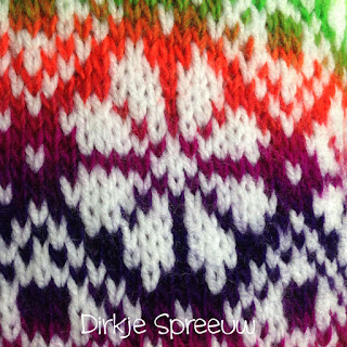 Aan de binnenkant verschijnt het patroon in een soort contrast. Ook dat wil ik graag netjes hebben. Veel breisters breien met in iedere hand een draad. Ik ben daar nog mee aan het worstelen. Ik krijg de draadspanning niet gelijk in beiden handen en dan wordt het breiwerk onregelmatig. Dus dat wordt nog verder oefenen.